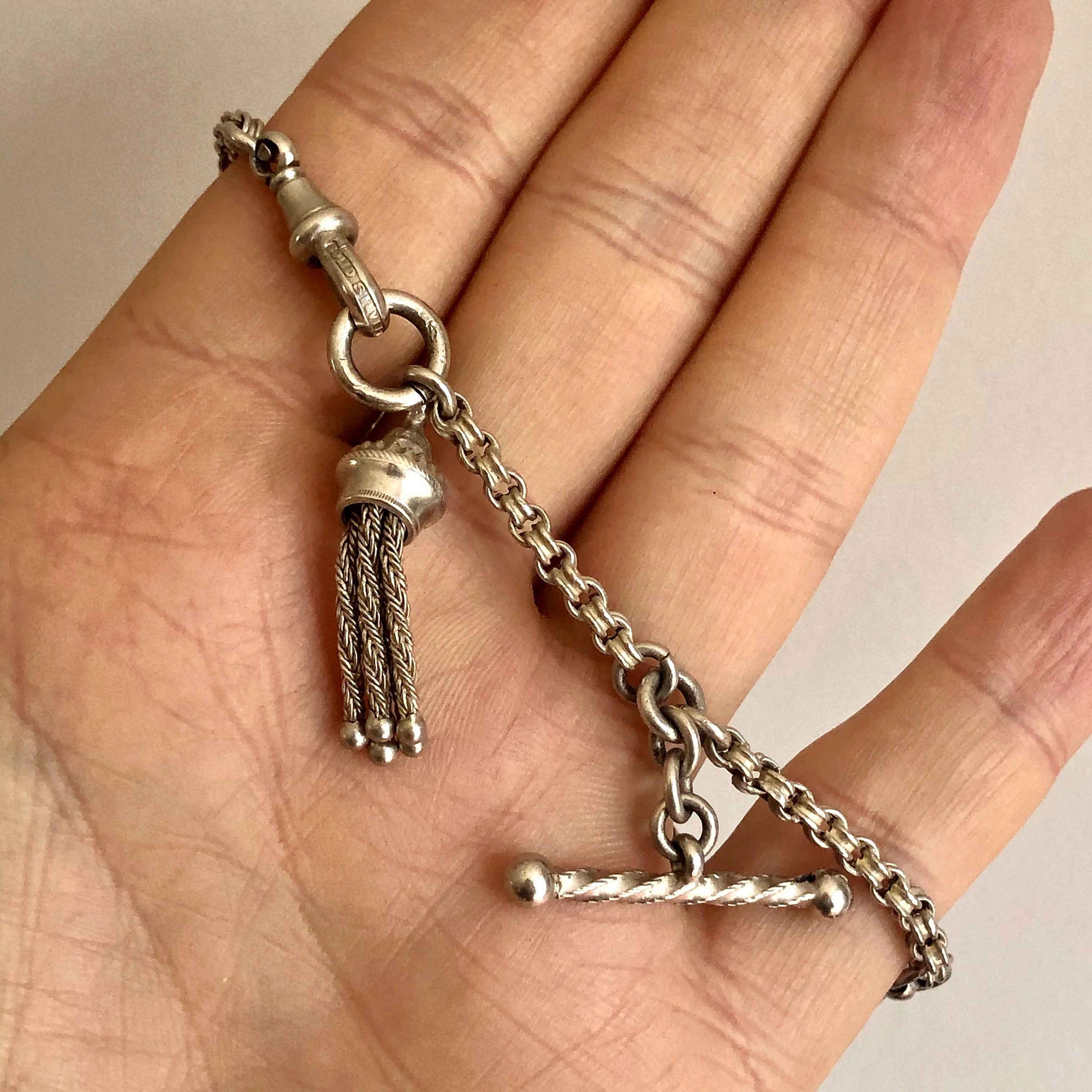 Marks: ‘Solid Silver’ on the swivel clasp, responds positively to tests for silver